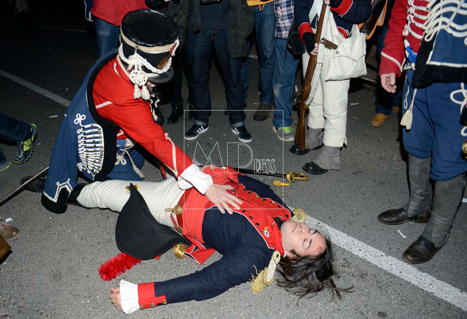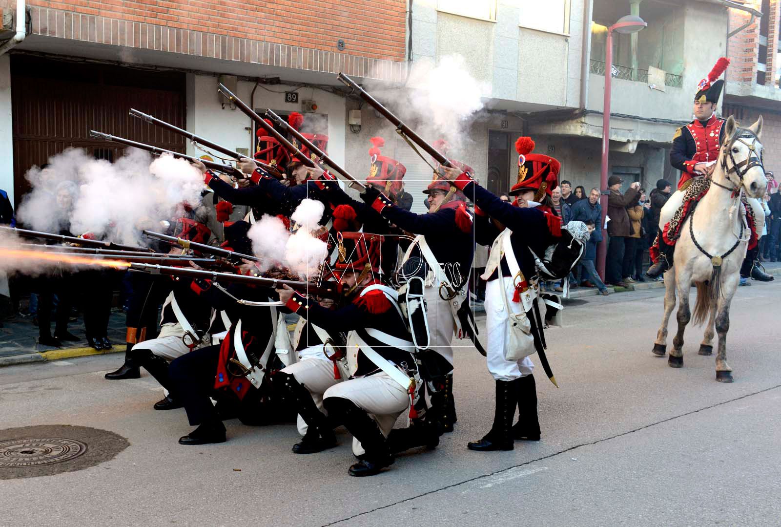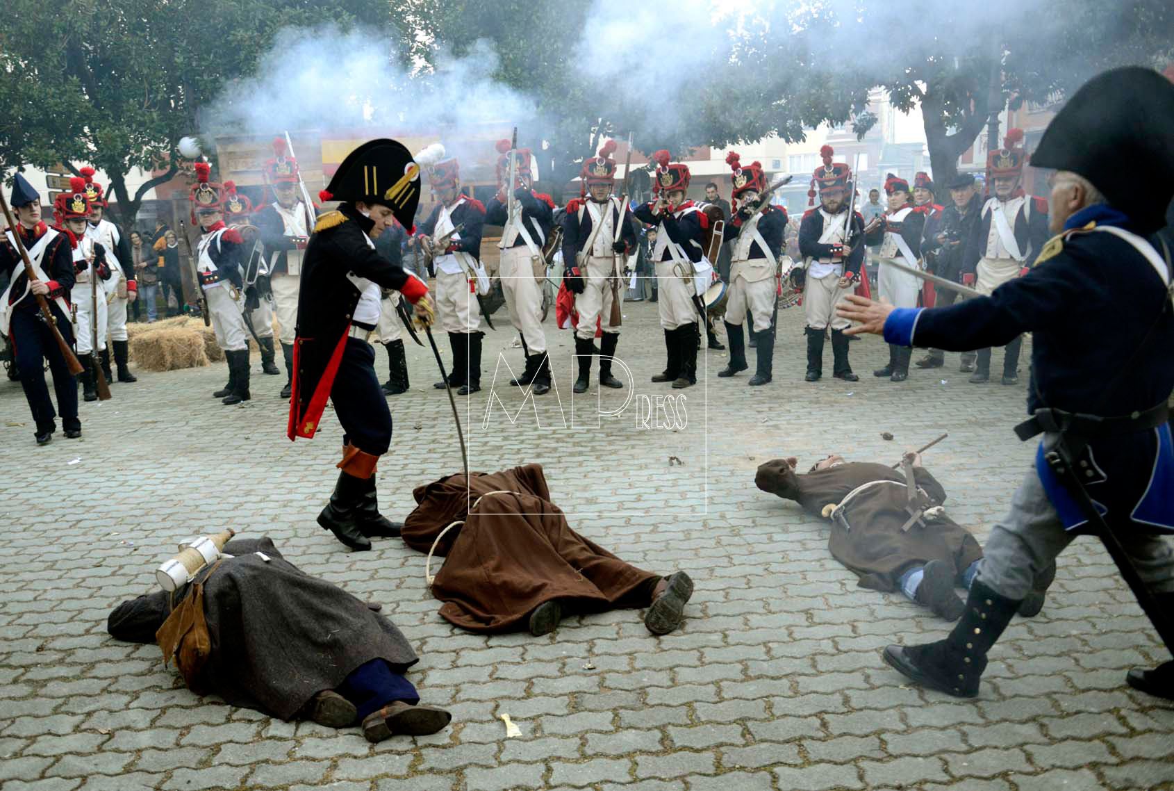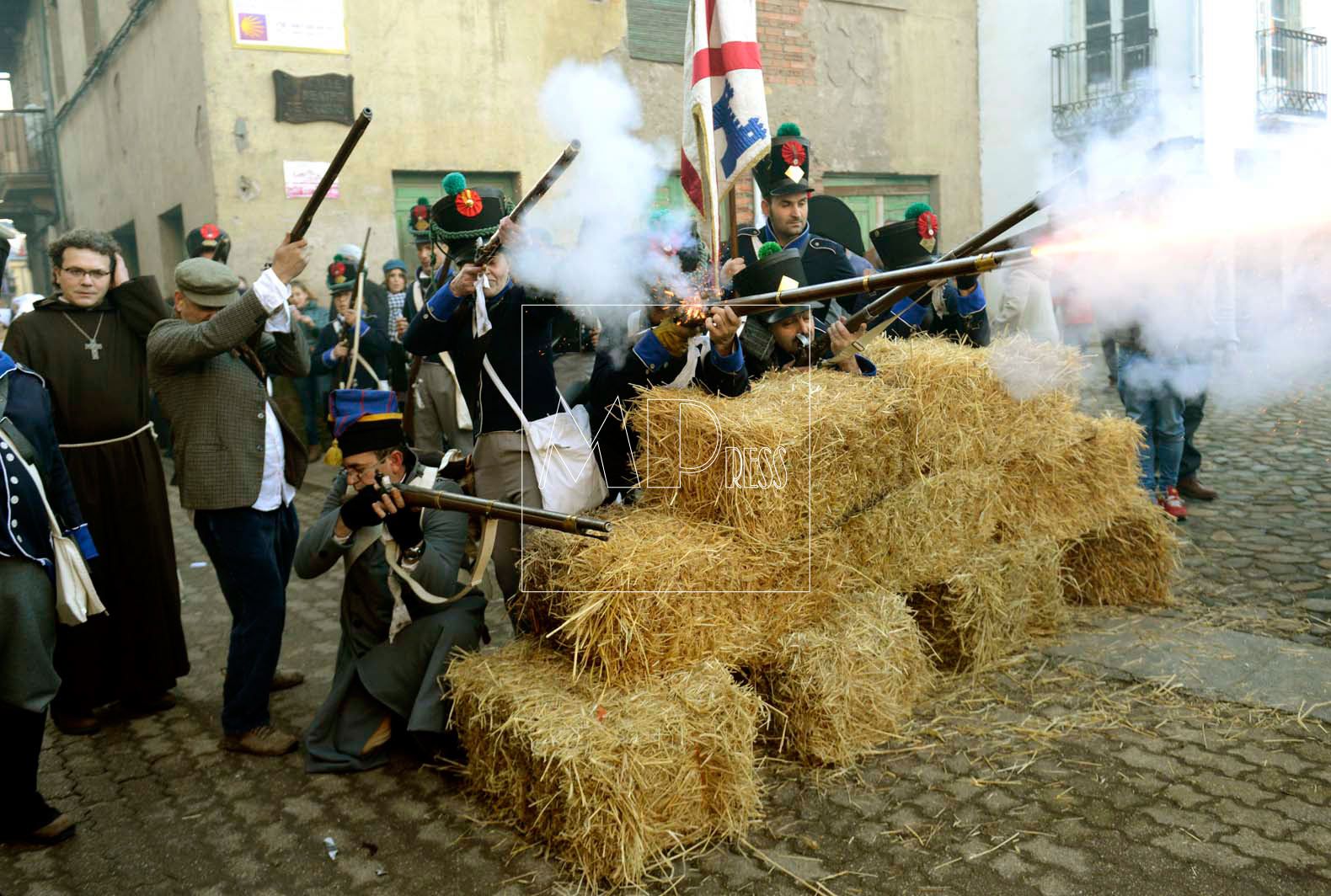 Cañones y fusiles disparan 50 kilos de pólvora que crean un auténtico clima bélico de sonido y olor. Y los descendientes de los paisanos hostigan con sus aperos de labranza a los soldados.