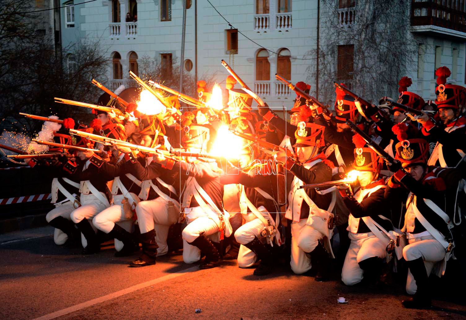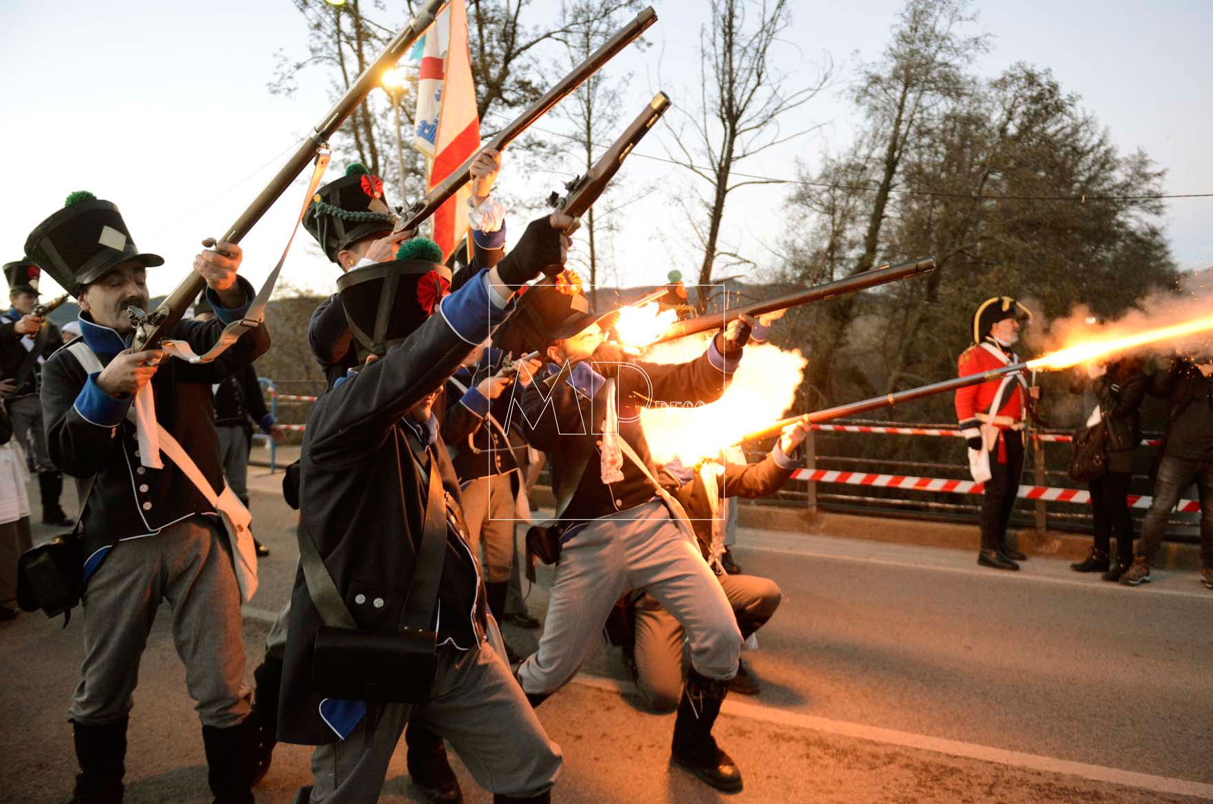 Centenares de vecinos y figurantes de Burgos, Euskadi, Galicia y Francia, con los coloristas uniformes de época y los fusiles correspondientes recorren las estrechas calles acosándose y persiguiéndose en el intento de tomar el Puente sobre el río Cúa para seguir camino.