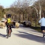 One flock of up to 500 Rubias del Molar sheep ( a native species now in danger of extinction ) are in charge of fire prevention and they do it by means of clearing the fields in this vast area. They are the firefighter sheep and little by little they graze this place going around every nook and cranny, eating all the tasty Winter and beginning of Spring grasses. They only lift their head to look at passers-by who walk near them and sometimes even pet them and occasionally even to watch the dozens of cyclists, roller skaters and joggers who, just like them, enjoy this beautiful green space in Madrid.
