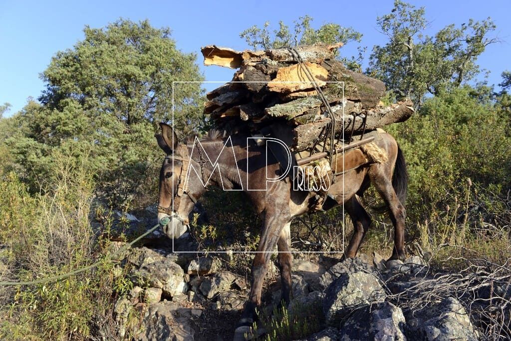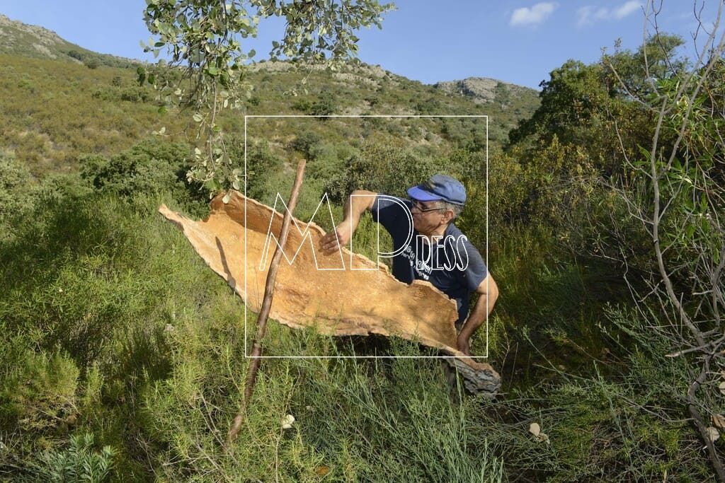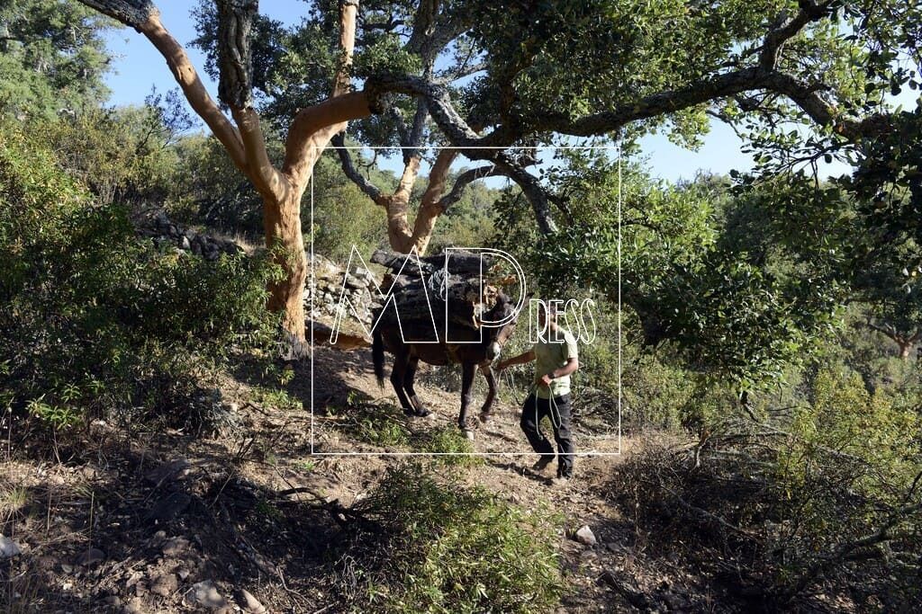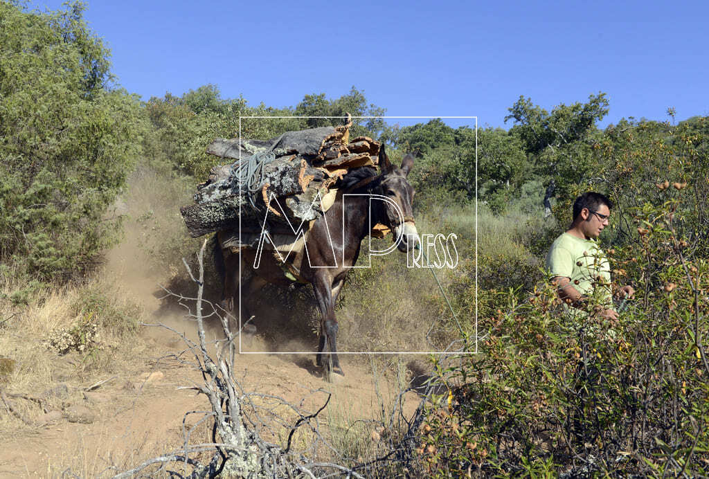 El Guindi, como le llaman los amigos, mientras caminamos con dificultad en desniveles del 20 y 30 por ciento, me enseña los restos de una paliza que le dio el mulo la semana pasada cuando se asustó por algún movimiento de otros animales, pues algunas sendas hay que abrirlas con un hacha en la maleza y limpiar para poder acceder a los alcornocales y cargar al mulo de corcho.