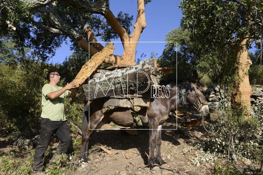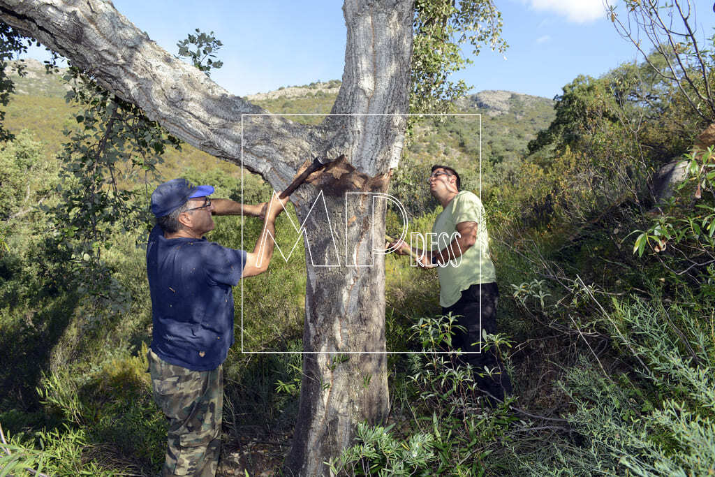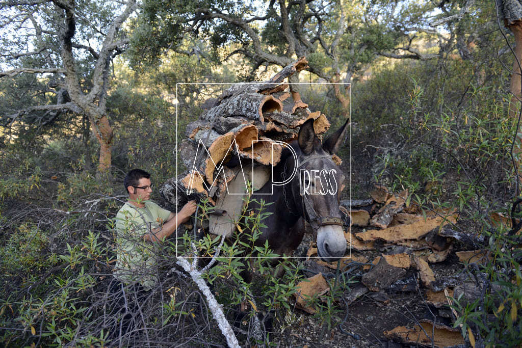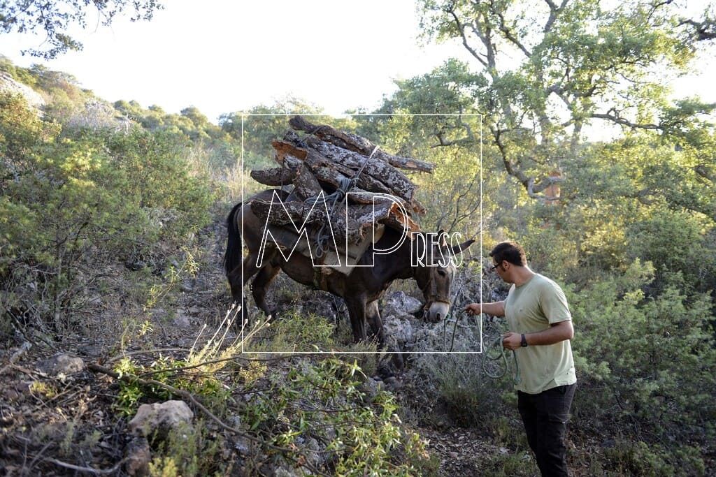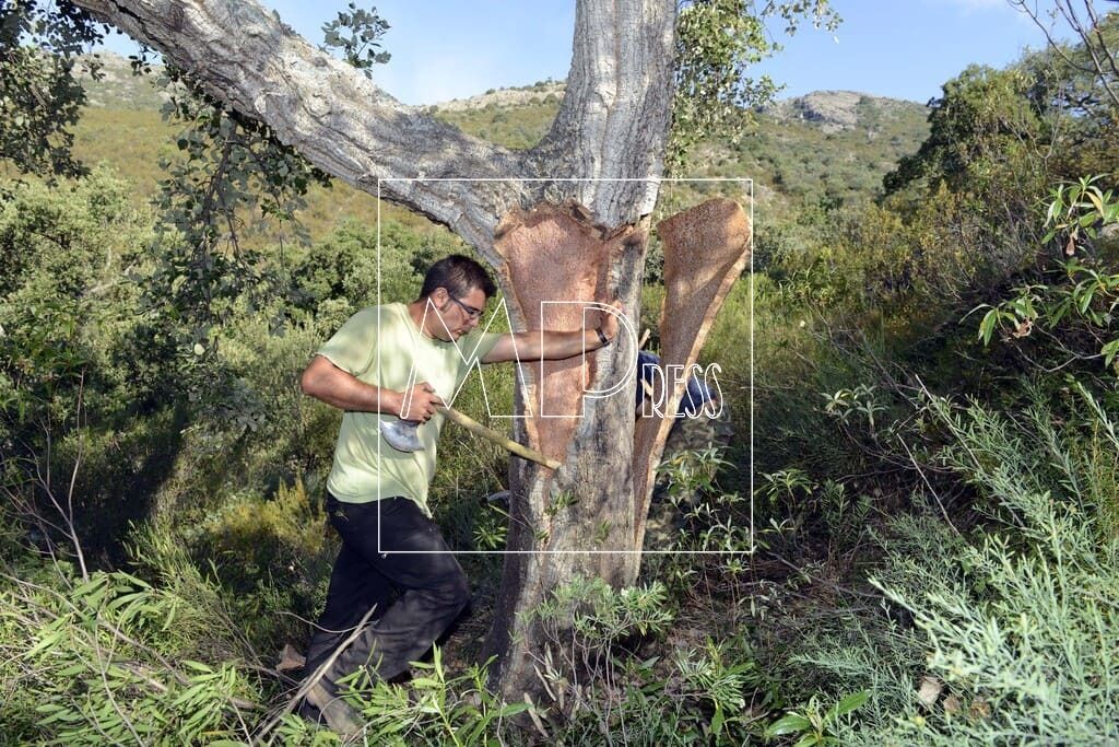 El Guindi, como le llaman los amigos, mientras caminamos con dificultad en desniveles del 20 y 30 por ciento, me enseña los restos de una paliza que le dio el mulo la semana pasada cuando se asustó por algún movimiento de otros animales, pues algunas sendas hay que abrirlas con un hacha en la maleza y limpiar para poder acceder a los alcornocales y cargar al mulo de corcho.