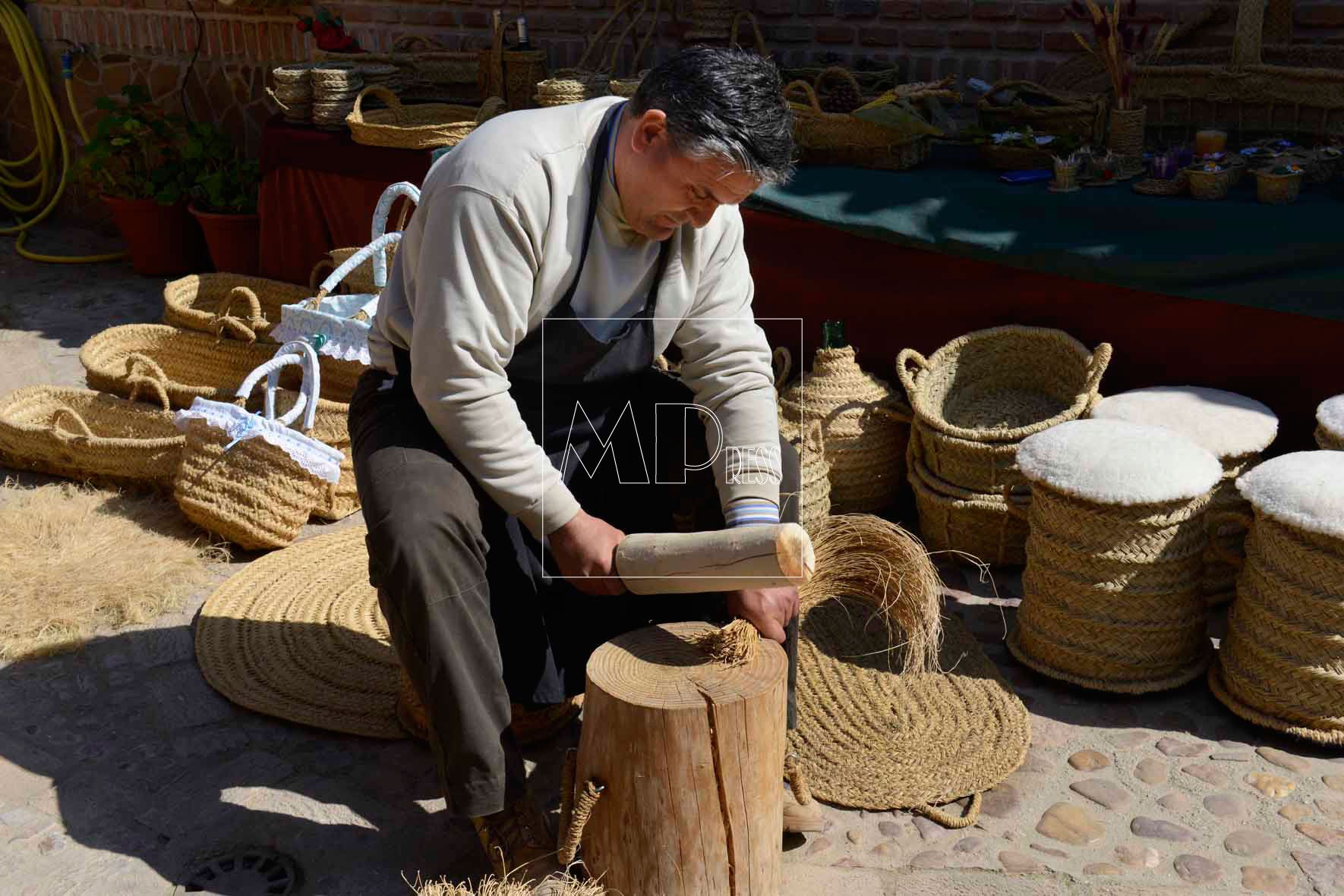En el patio de su casa, Julio montó un taller en el que trabaja duro golpeando con una maza de madera de encina los manojos de esparto hasta que queda suave para darle forma con las manos. Una alfombra le lleva más de doscientas horas, pero también hace cinchos para el queso, forros para garrafones o botellas, rediles para el ganado, cuerdas, aparejos para animales, cestos, sillas, persianas o bolsos de señora.