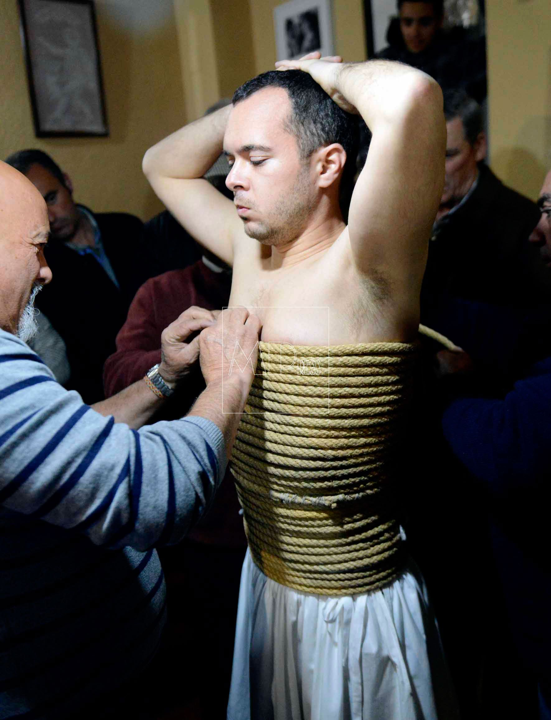 Cerca de Las Barrancas, en Valverde de la Vera, Daniel Incera se envuelve todo en esparto según la tradición en la Noche de los Empalaos.