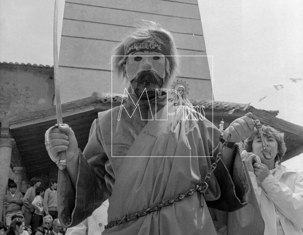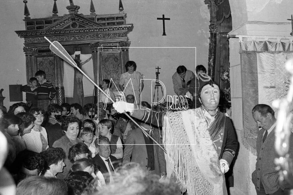 La procesión representa la conversión del bandido San Sebastián, comienza en la Iglesia de San Juan Bautista, recorriendo las calles de la villa, donde todos los visitantes disfrutan el paso marcial de un capitán de rostro cubierto con una careta y portando en su brazo derecho una lanza muy desafiante y en su mano izquierda apoyada en su espada, con un gorro Napoleónico y con un traje militar negro, con tres estrellas de capitán en la boca manga y con un mantón blanco con flores bordadas y con zapatos de color negro, con los que marcha de manera muy firme durante todo el recorrido, hasta llegar a destrozarlos.