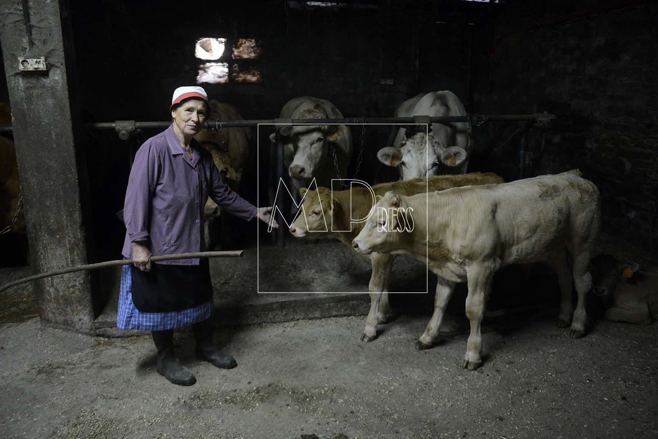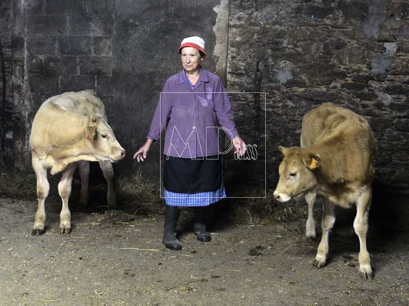 Me encuentro con Maricarmen Sánchez, madre de Ramón, una mujer ataviada con una bata azul de cuadros, delantal negro, chaqueta morada, gorro blanco y con vara en mano, ya preparada para la dura jornada. Entradita en años pero que se mueve como una mujer joven, trata a su ganado de una manera muy especial y con mucho cariño; presume de que todos los terneros la conocen. Siempre y con el apoyo de su hijo, se reparten el duro trabajo de cada día para tener en condiciones máximas de calidad, las treinta y dos cabezas de vaca.