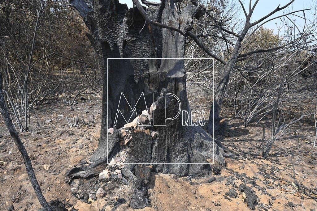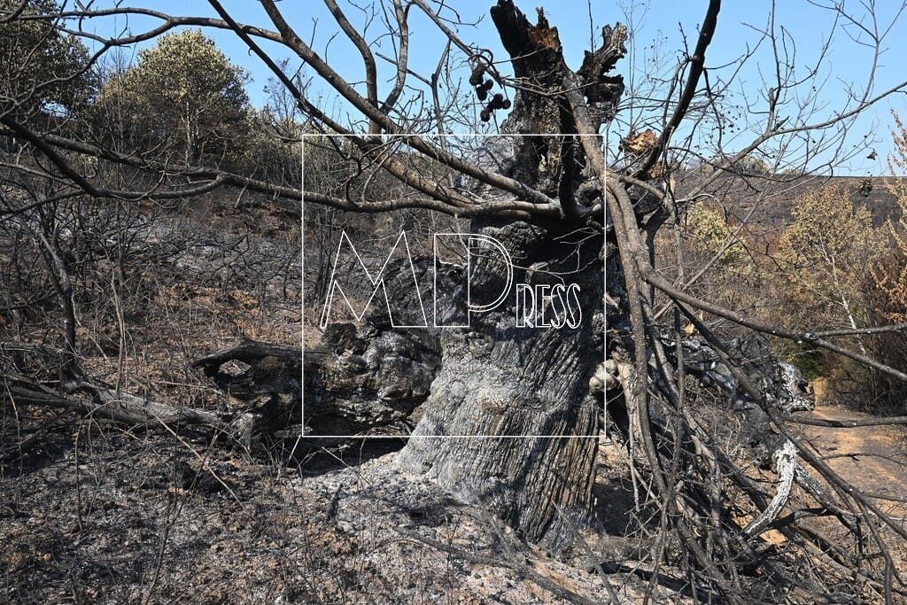 El silencio que domina el entorno solo se rompe por el crujir de las hojas chamuscadas de cientos de castaños centenarios. Árboles de circunferencias de hasta cuatro metros han sido consumidos incluso por debajo de la superficie, convertidos ahora en esculturas carbonizadas. Pinos completamente quemados cuelgan aún con piñas ennegrecidas, mientras que el suelo desprende un calor sofocante entre las cenizas.