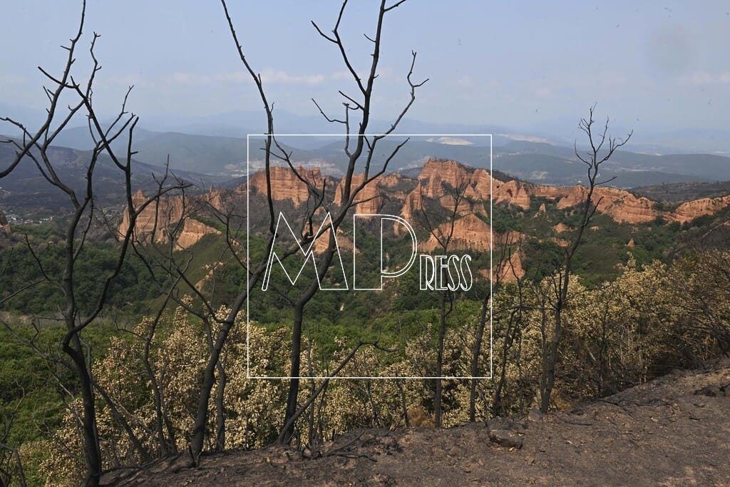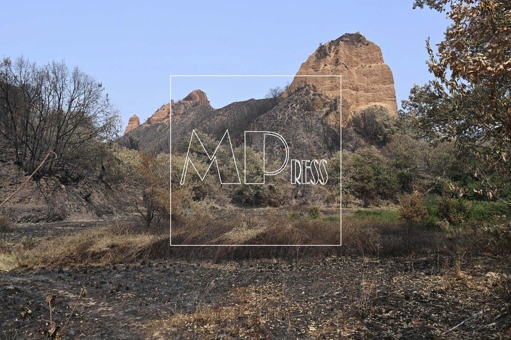 Las Médulas (León). — Más de 4.000 hectáreas han quedado calcinadas por el incendio declarado el pasado 9 de agosto en la comarca berciana. El fuego ha devastado un territorio de gran valor cultural, histórico y medioambiental, ya que Las Médulas —antigua explotación aurífera romana y declarada Patrimonio de la Humanidad por la UNESCO— se han visto gravemente afectadas.